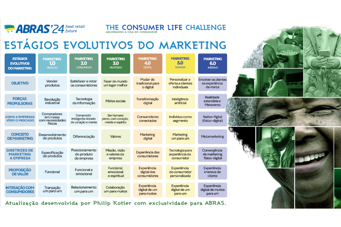 Esse material foi publicado nos livros de Kotler apenas com as fases do Marketing 1.0 ao 3.0. A pedido da ABRAS, Kotler atualizou a matriz, incluindo as evoluções do Marketing 4.0 ao 6.0. “Portanto, esta matriz é inédita no mundo. Não existe este documento elaborado por Philip Kotler em nenhum outro lugar, nem em livros”, afirmou Segurado.