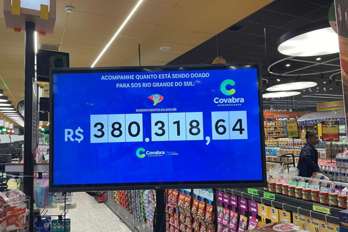 Em mais uma corrente de solidariedade, o Covabra Supermercados doou R$ 380 mil para o programa SOS Rio Grande do Sul, canal oficial de doações do governo do Rio Grande do Sul. O valor é resultado da campanha “SOS Rio Grande do Sul” criada pela rede, que destinou para doação 10% do valor das vendas de produtos gaúchos realizadas entre 18 de maio e 30 de junho em todas as lojas e no e-commerce.