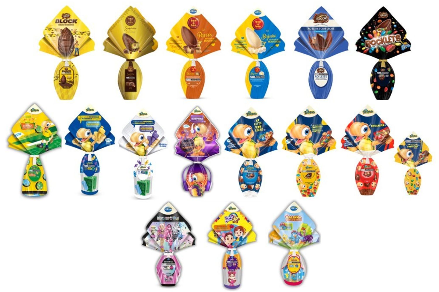 A Páscoa Mágica da Arcor apresenta novidades que prometem surpreender e agradar toda a família com ovos de suas principais marcas e com a reconhecida cremosidade característica de seus produtos. O gigante dos chocolates, Block, chega em molde exclusivo e diferenciado com amendoins inteiros na casca do ovo que oferecem crocância e muito sabor, enquanto o ovo Bon o Bon Supreme, assim como o bombom, é feito com um delicioso chocolate ao leite e avelãs trituradas. Outra novidade é o ovo Bon o Bon Paçoca, inspirado no bombom da marca, ele é feito com a deliciosa receita de chocolate ao leite com pedacinhos de paçoca na casca e acompanha um bombom.