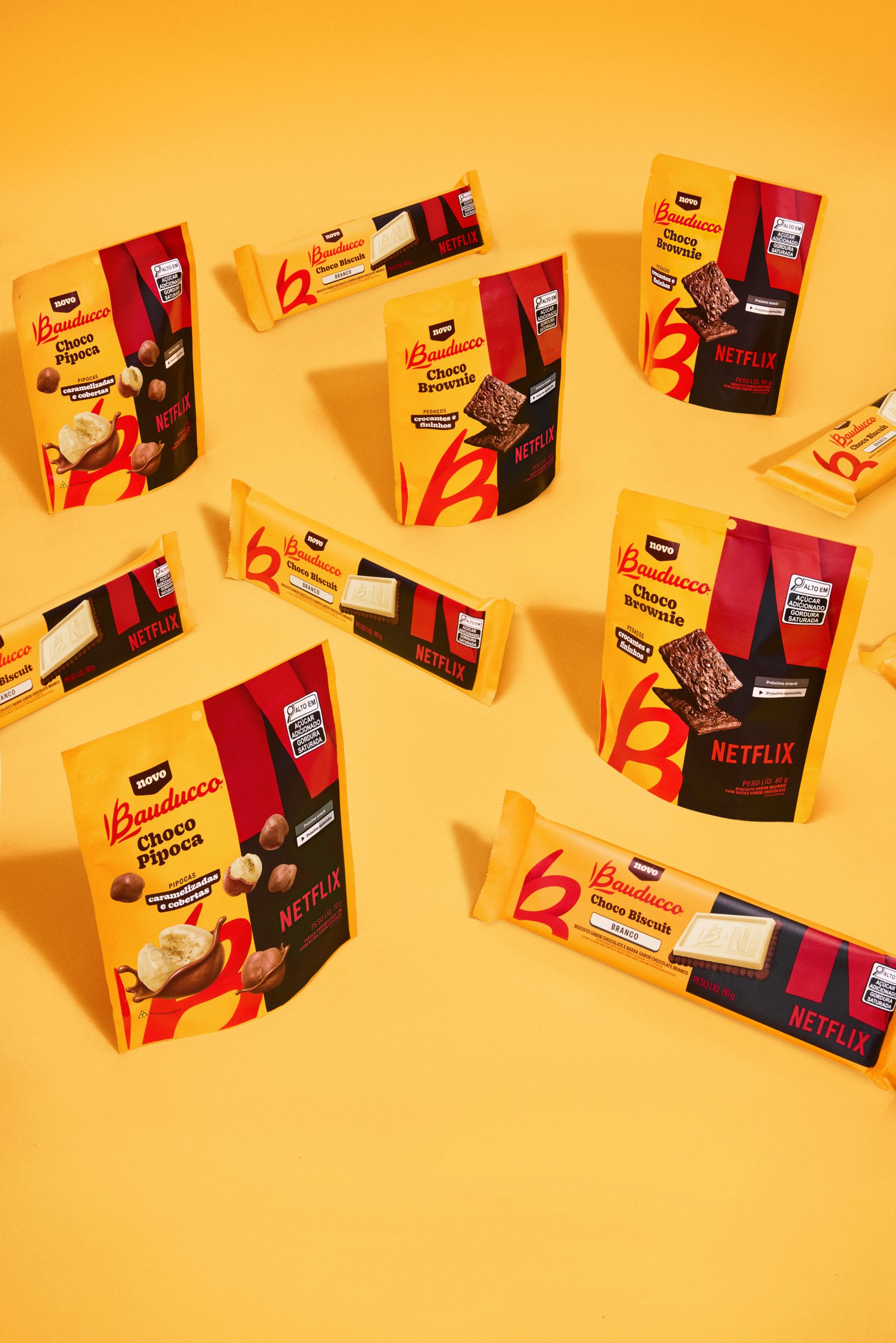 O match entre lovebrands acontece de forma estratégica e cria o cenário perfeito para os devoradores: consumir séries e snacks ao mesmo tempo, resultando em uma experiência completa nos momentos de maratona. A Bauducco® incorpora as cores preto e vermelho, da marca da Netflix, nas embalagens dos lançamentos, além do icônico símbolo de “próximo episódio”, refletindo também na comunicação, com o degradê das cores ao fundo, e na mistura de fontes do universo de ambas em KV e peças.