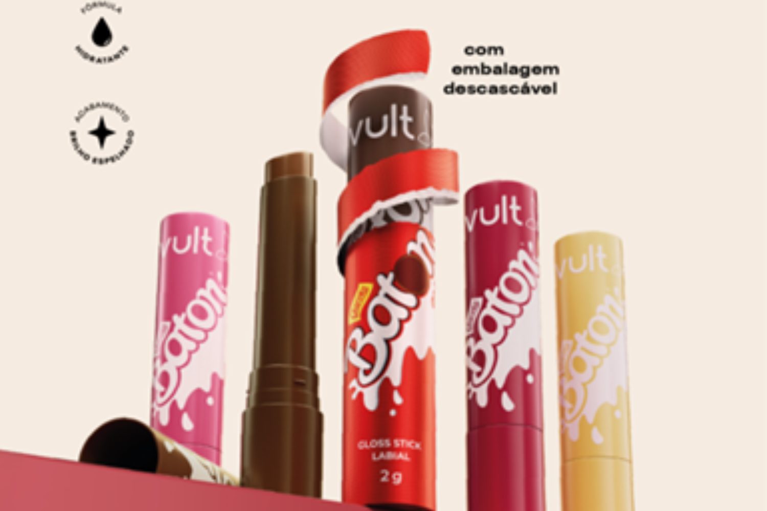 Em um movimento que une memória afetiva, inovação de portfólio e estratégia cultural, Vult anuncia sua collab com Baton®, marca ícone de Garoto, para lançar uma coleção de gloss stick inspirado no chocolate que marcou gerações. A parceria transforma um dos produtos mais icônicos do Brasil em item de beleza que evoca nostalgia e transforma maquiagem em experiência, com uma embalagem descascável, textura que derrete nos lábios e brilho espelhado. Além disso, o lançamento se apresenta como uma escolha para presentear, especialmente quem é apaixonado, nesta Páscoa.