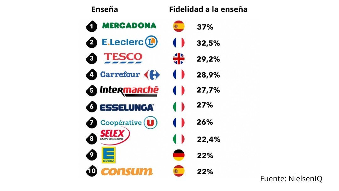 A rede espanhola de supermercados Mercadona é a varejista que mais fideliza seus clientes no varejo europeu. De acordo com um estudo realizado pela NielsenIQ, a empresa concentra 37% dos gastos totais de seus clientes, seguida pela francesa E.Leclerc (32,5%) e pela britânica Tesco (29,2%).