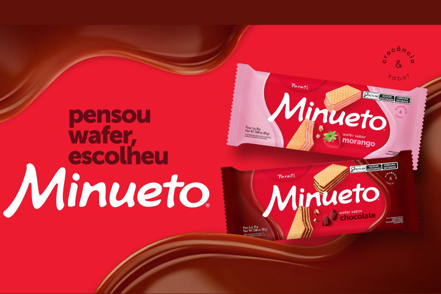 Minueto, marca de biscoito Wafer da Parati, lança nova identidade visual para 2026. O movimento busca a consolidação como a principal referência no segmento de Wafer, trazendo um design moderno que visa elevar a percepção de valor do produto junto ao consumidor final. A nova embalagem reposiciona os elementos para realçar a crocância do Wafer e a cremosidade do recheio, rompendo o padrão atual das embalagens de Wafer presentes nas gôndolas.