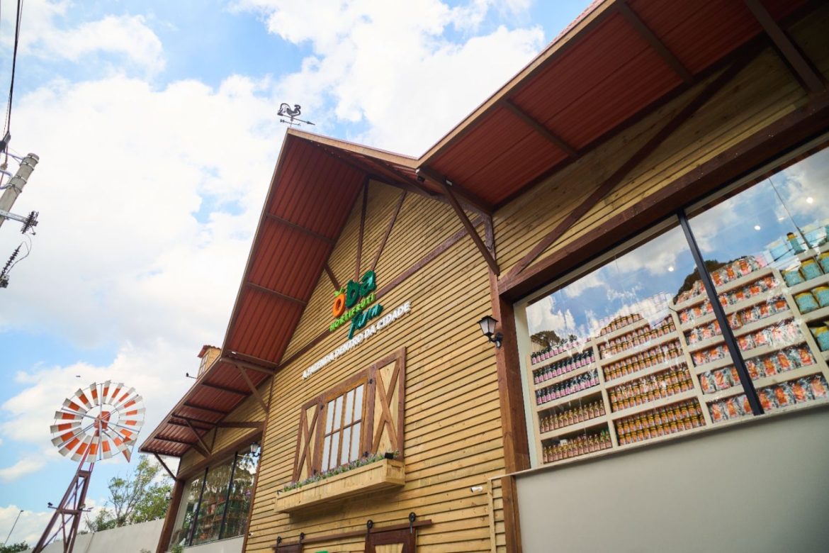 O ambiente segue o padrão visual característico do conceito Oba Farm, com estrutura de madeira rústica, iluminação acolhedora e decoração inspirada no campo, criando uma experiência de compra leve e prazerosa.