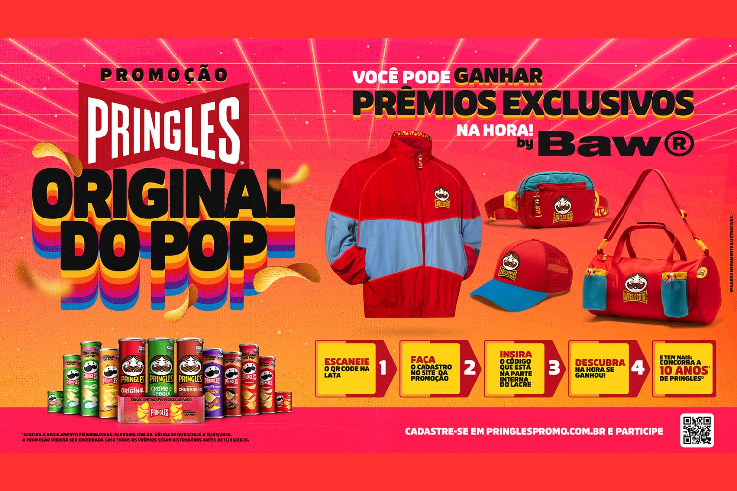 A promoção aposta em uma mecânica simples e de fácil adesão, desenvolvida para gerar engajamento imediato. Ao adquirir qualquer produto da marca, o consumidor cadastra o pincode presente no lacre interno da lata no site da campanha e descobre, na hora, se foi contemplado com um dos prêmios instantâneos, reforçando a sensação de ganho imediato e estimulando a participação. Cada cadastro válido também garante 1 número da sorte para participar de outro sorteio da mesma campanha, que premiará o vencedor com um cartão pré-pago — sem função saque ou transferência — equivalente ao consumo de 10 anos de Pringles. Com prêmios instantâneos assinados pela BAW, marca reconhecida por sua forte conexão com o universo streetwear, a iniciativa amplia sua relevância ao dialogar diretamente com o público jovem e conectado.