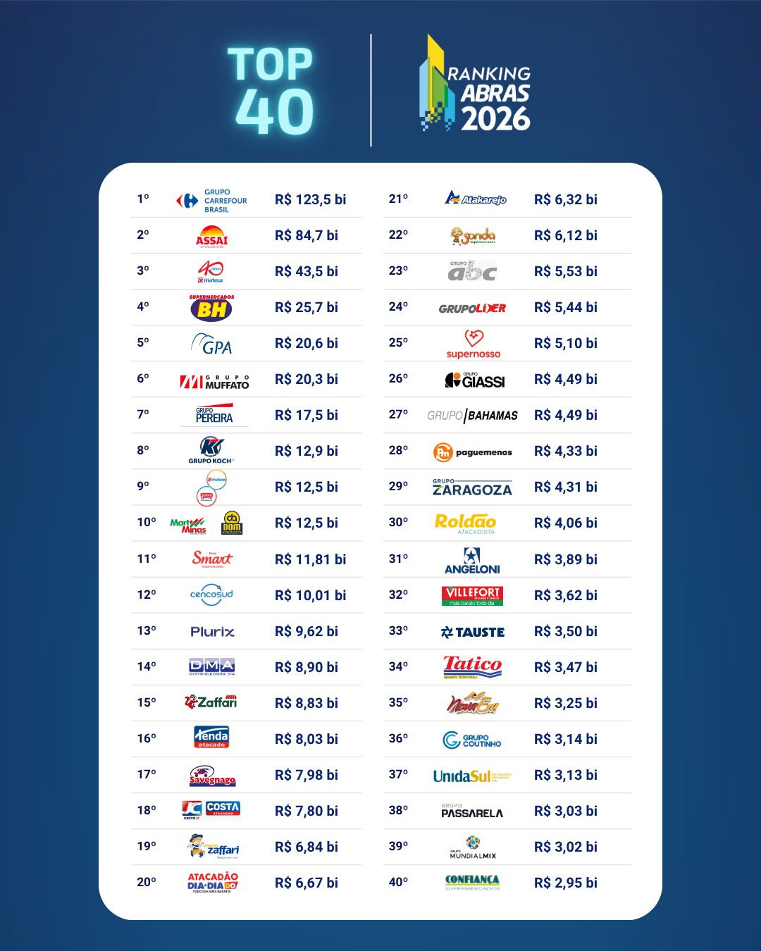 Entre as 40 maiores redes supermercadistas do Brasil, o Grupo Carrefour Brasil manteve a liderança pelo décimo ano consecutivo, com faturamento de R$ 123,5 bilhões em 2025. Em segundo lugar, aparece o Assaí Atacadista, com R$ 84,7 bilhões, seguido pelo Grupo Mateus, com R$ 43,5 bilhões.