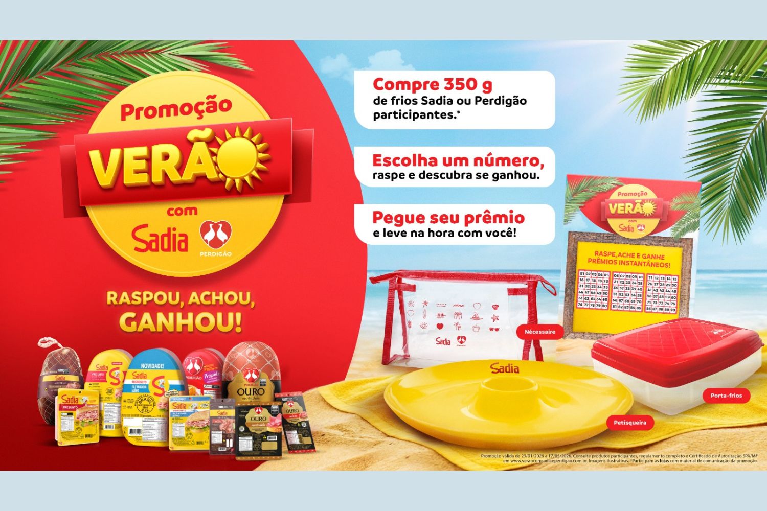 Já na Raspadinha, ao comprar 350g de frios Sadia ou Perdigão, o consumidor poderá escolher um número para raspar no próprio estabelecimento, e saberá na hora se foi premiado. Caso seja o ganhador, poderá escolher um brinde personalizado das marcas, sendo petisqueira, porta-frios ou necessaire.
