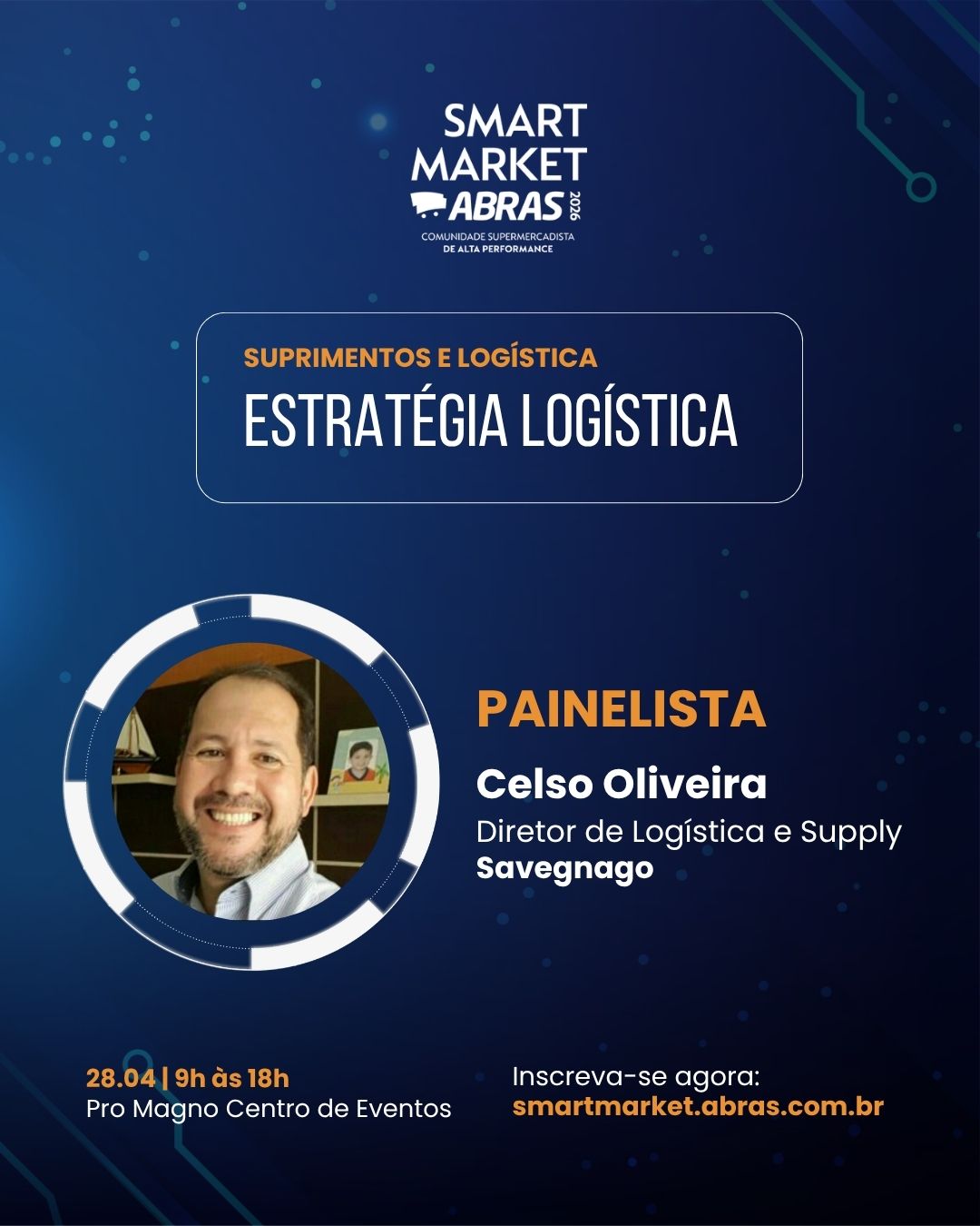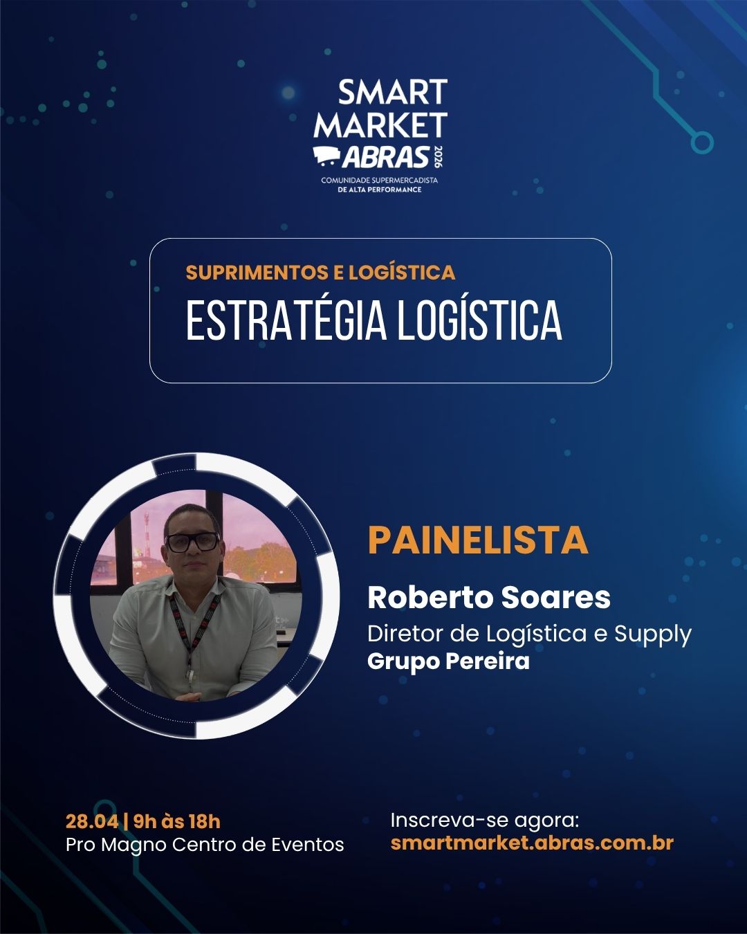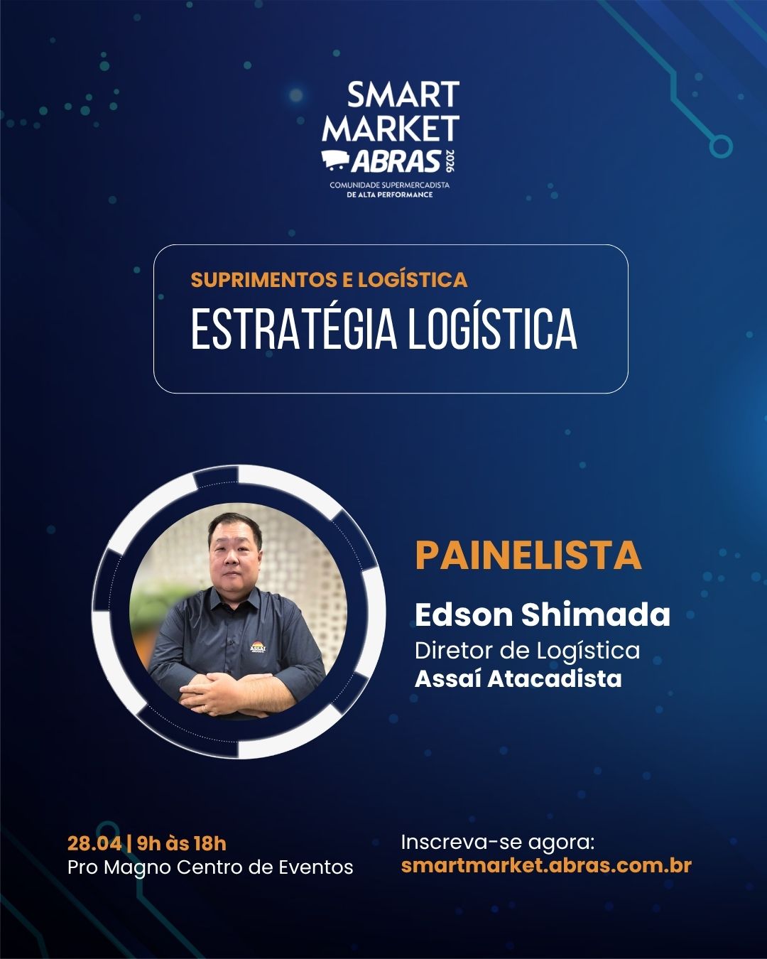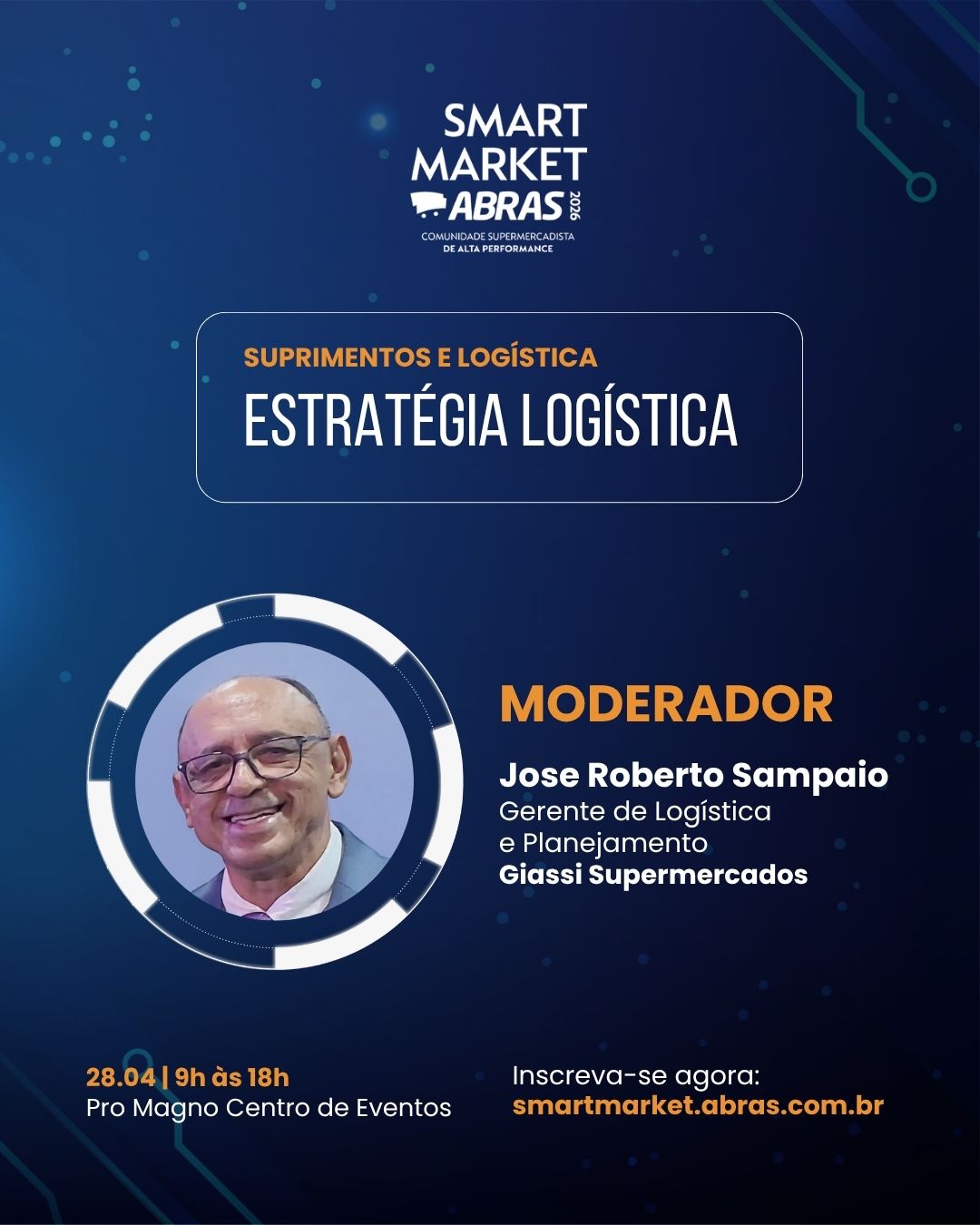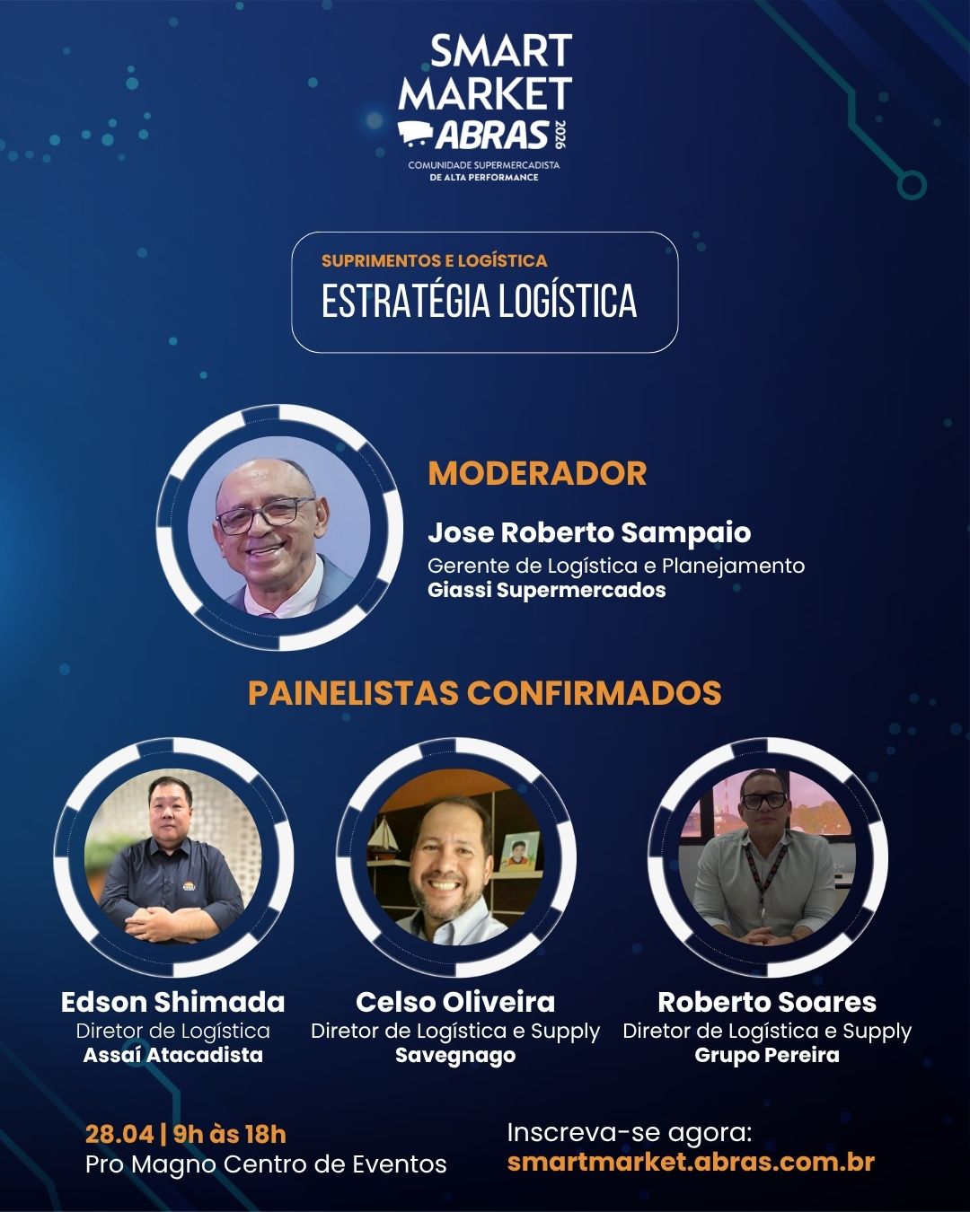 Com a presença confirmada de líderes do setor, falando de supermercadista para supermercadista. Jose Roberto Sampaio (Giassi Supermercados), executivo de alta performance da comunidade de supply chain, será o moderador desse painel inédito, que reunirá líderes de supply chain comprometidos com a estratégia logística, Edson Shimada (Assaí Atacadista), Celso Oliveira (Savegnago Supermercados) e Roberto Soares (Grupo Pereira).