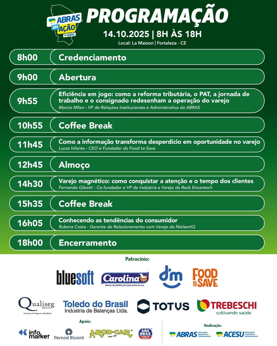 “Esta terceira edição do ABRAS em Ação promovida em parceria com a Acesu representa a continuidade de uma trajetória construída com responsabilidade e visão de futuro. Temos orgulho de dar sequência a uma ação grandiosa, fruto do esforço e dedicação das gestões anteriores, que abriram caminhos importantes para que esse evento ganhasse o espaço e a relevância que tem hoje. Ao mesmo tempo, temos o compromisso de avançar. Nesta nova fase, seguimos ampliando os horizontes da Acesu com novas entregas, fortalecendo a representatividade dos supermercadistas cearenses e promovendo conexões estratégicas que geram valor real para o setor varejista alimentar. A programação desta edição foi cuidadosamente elaborada para refletir os desafios e oportunidades atuais do nosso setor, com temas que abordam desde eficiência operacional e legislação até comportamento do consumidor, tecnologia e formação de lideranças. Trata-se de um encontro que qualifica, inspira e prepara os nossos profissionais para o presente e o futuro do varejo alimentar. Aproveito para agradecer ao presidente da ABRAS, João Galassi, e ao vice-presidente de Relações Institucionais e Administrativo da ABRAS, Marcio Milan, pela parceria constante e pela confiança na Acesu. A presença da ABRAS no Ceará fortalece todo o setor e amplia nosso alcance enquanto associação estadual comprometida com a evolução do varejo alimentar”, declarou a presidente da Associação Cearense de Supermercados (Acesu), Cláudia Novais.
