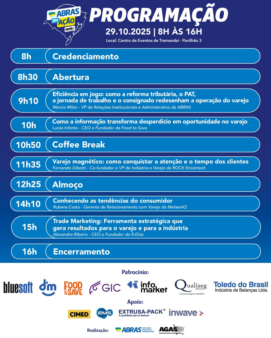 Para o vice-presidente de Relações Institucionais e Administrativo da ABRAS, Marcio Milan, “a colaboração entre as partes envolvidas é a chave para um mercado mais competitivo e eficiente. Estamos focados em fortalecer essa cooperação e promover um ambiente onde todos os elos da cadeia supermercadista possam se desenvolver e prosperar. O ABRAS em Ação é uma oportunidade valiosa para discutirmos as tendências, práticas inovadoras e os desafios do setor, sempre com o objetivo de integrar o varejo local às melhores práticas do mercado”.