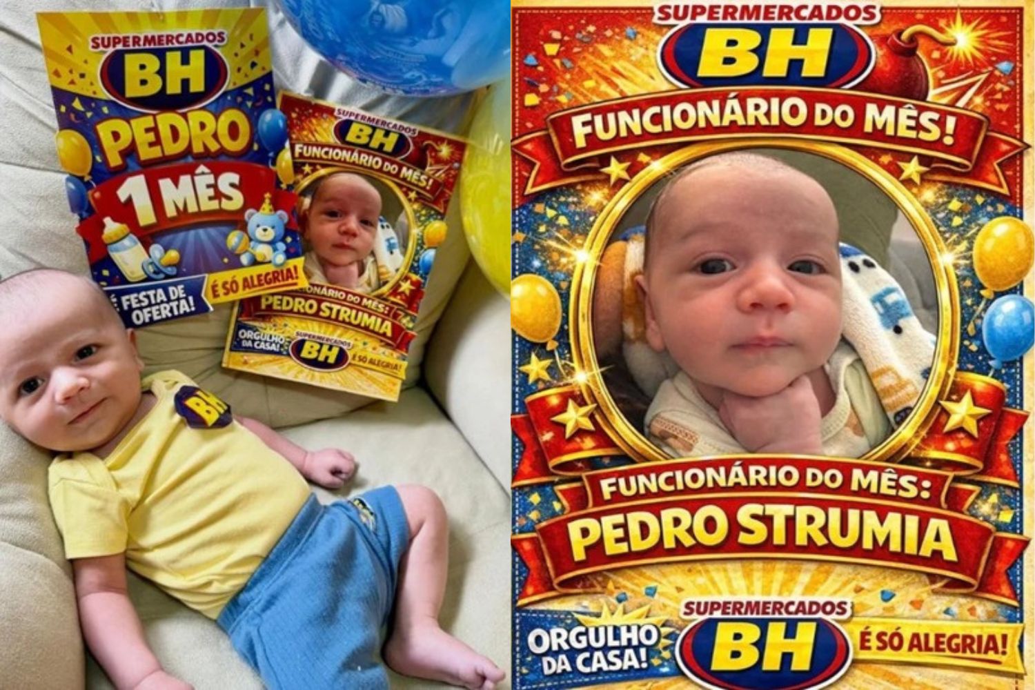 As fotos compartilhadas nas redes sociais dos pais mostram o bebê caracterizado como “funcionário do mês”, em um cenário montado com elementos que remetem à identidade visual dos Supermercados BH. A decoração apostou principalmente nas cores amarela e azul, presentes no bolo temático, nos balões e nas placas personalizadas com o nome do bebê e a referência ao “mêsversário”.