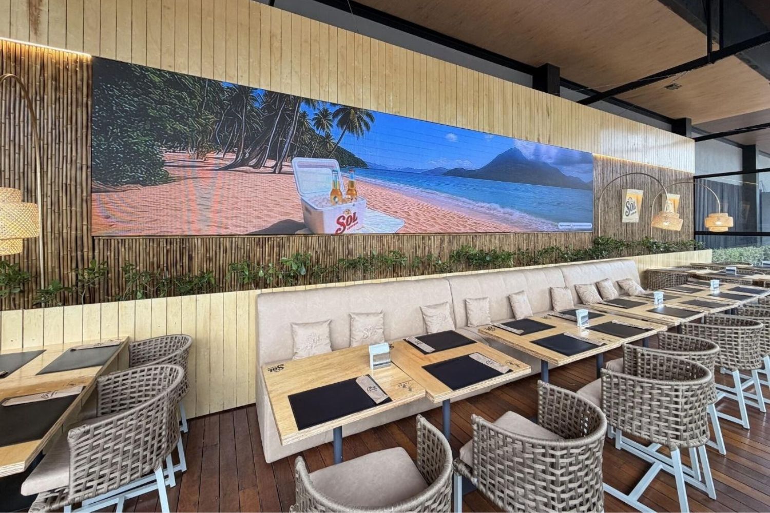 Um dos grandes destaques do projeto é o telão de LED interativo, que acompanha a dinâmica do sol ao longo do dia. Conforme as horas avançam, a iluminação e o conteúdo exibido evoluem gradualmente, finalizando em um pôr do sol ao entardecer. Esse detalhe sensorial transforma completamente a atmosfera do espaço e reforça a conexão das marcas com o momento de consumo de forma natural e emocional.