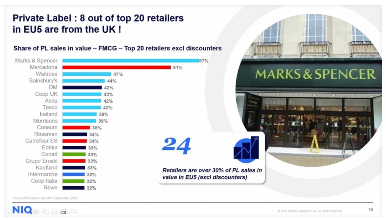 Entre as 20 redes com maior penetração de itens de marca própria no varejo europeu (excluindo redes de desconto) estão 8 varejistas britânicas: Marks & Spencer, Waitrose (3ª colocada, com 47%), Sainsbury’s, Coop UK, Asda, Tesco, Iceland e Morrisons. O segundo país mais representado na lista é a Alemanha, com 5 representantes (DM, Rossman, Edeka, Kaufland e Rewe). O varejo espanhol foi representado na lista por Mercadona, Consum, Carrefour Espanha e Eroski.