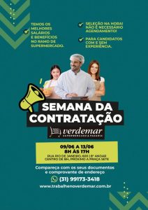 A rede de supermercados Verdemar promove, até 13 de junho, mais uma edição da Semana da Contratação, com atendimento presencial para candidatos interessados em compor o time da empresa. A seleção será realizada das 8h às 17h, na Rua Rio de Janeiro, 600, 8º andar, no Centro da capital mineira, próximo à Praça Sete.