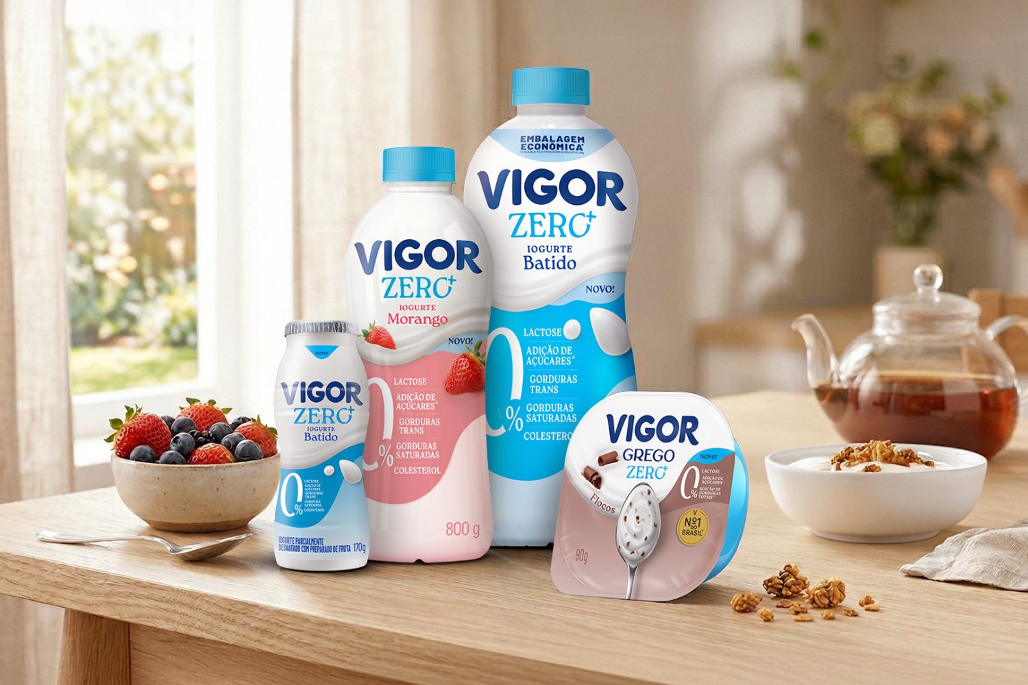 Já na categoria de iogurtes gregos, na qual a marca lidera o mercado brasileiro, a Vigor lança a versão Triplo Zero da linha Zero+. Os produtos são zero adição de açúcares, gorduras totais e lactose e apresentam redução de 65% de calorias em comparação à versão tradicional de 90g. Os sabores disponíveis são Tradicional, Morango e Flocos.